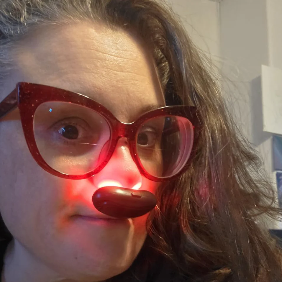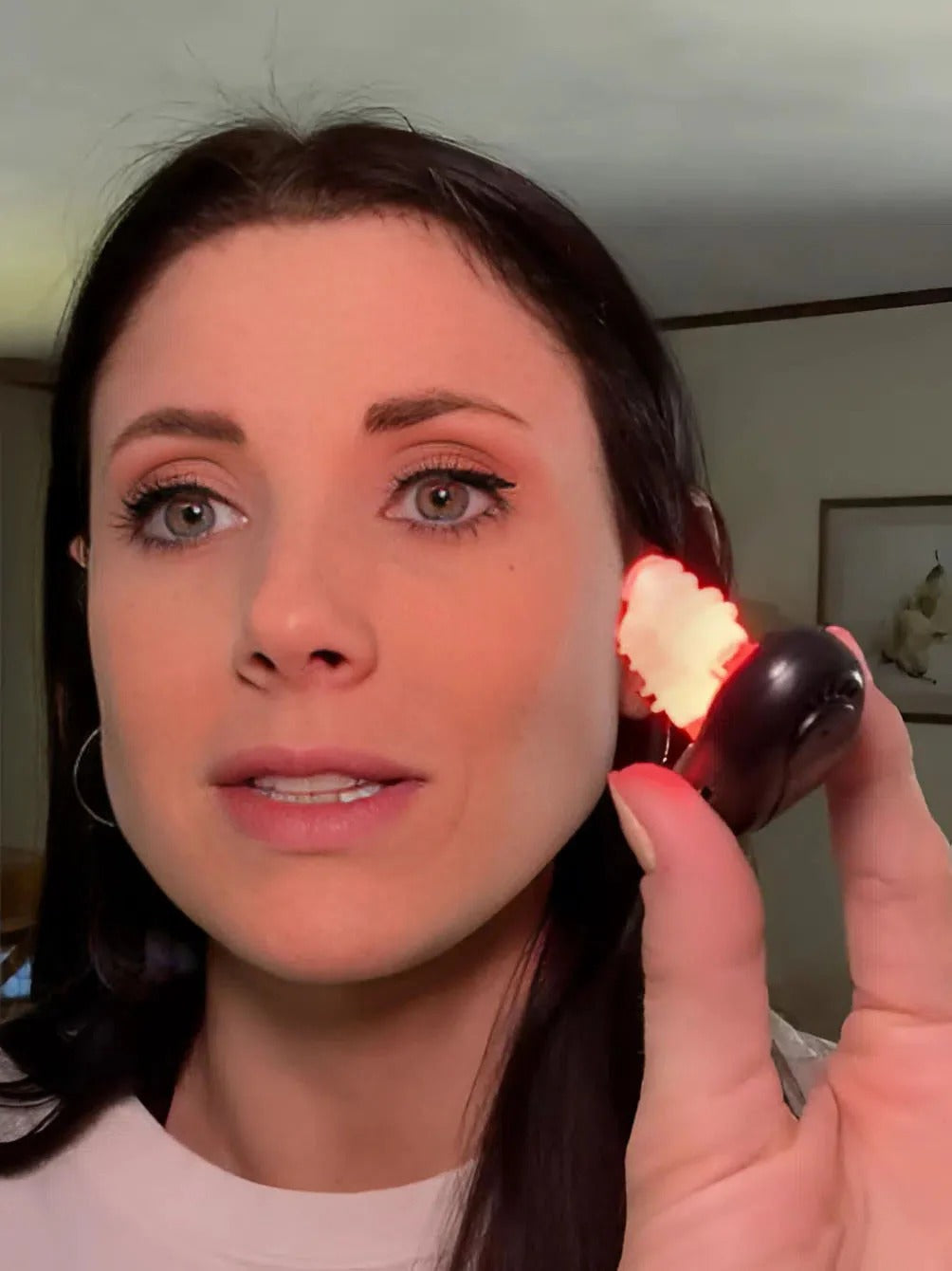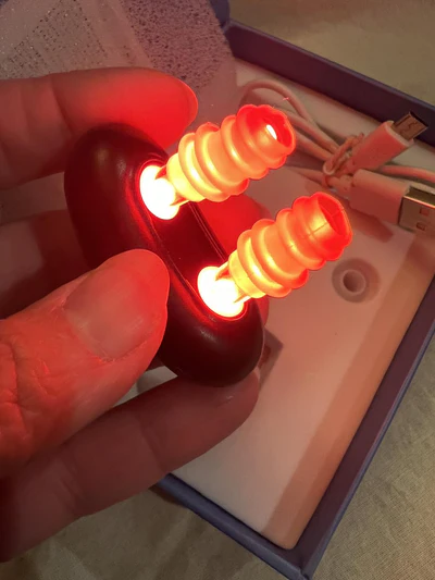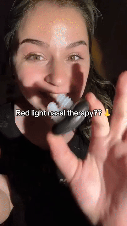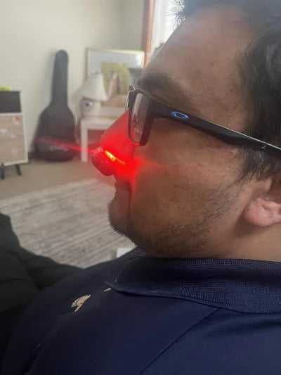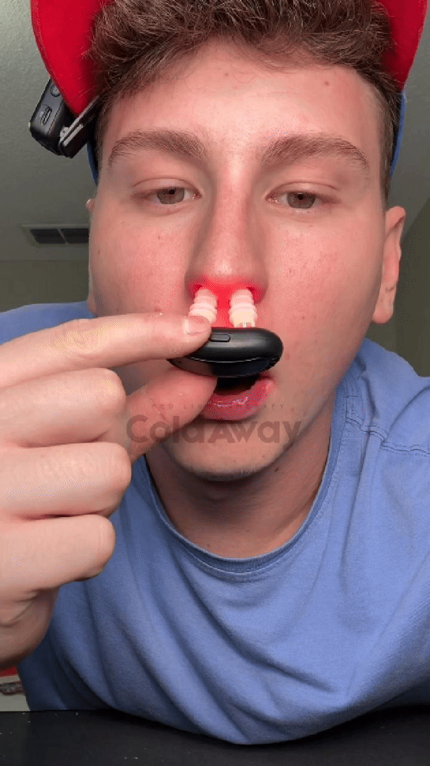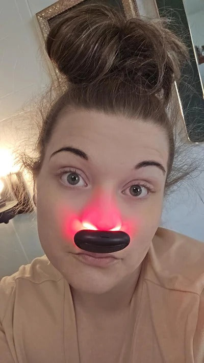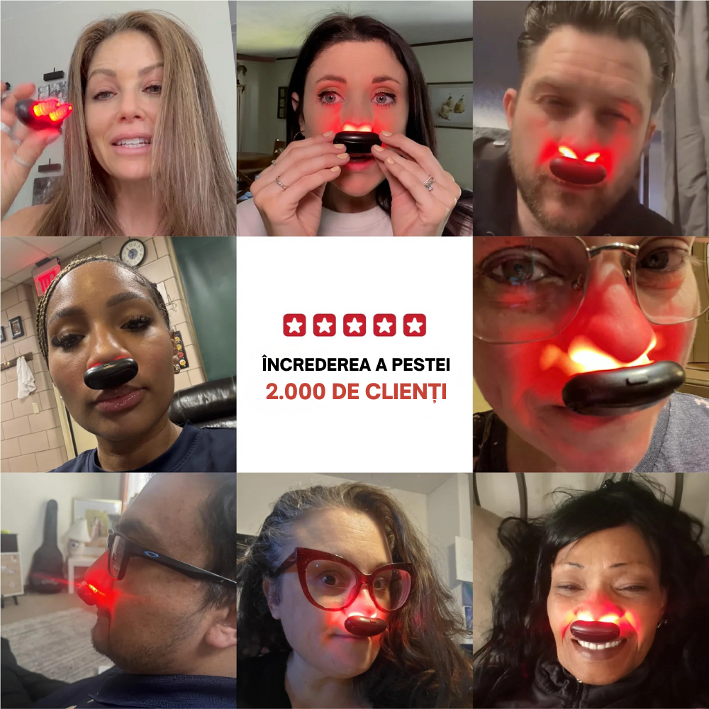 Două vârfuri moi din silicon emit o lumină roșie calmă în jurul zonei nazale. Majoritatea utilizatorilor descriu o căldură ușoară și o potrivire confortabilă — fără lichide, fără mizerie.